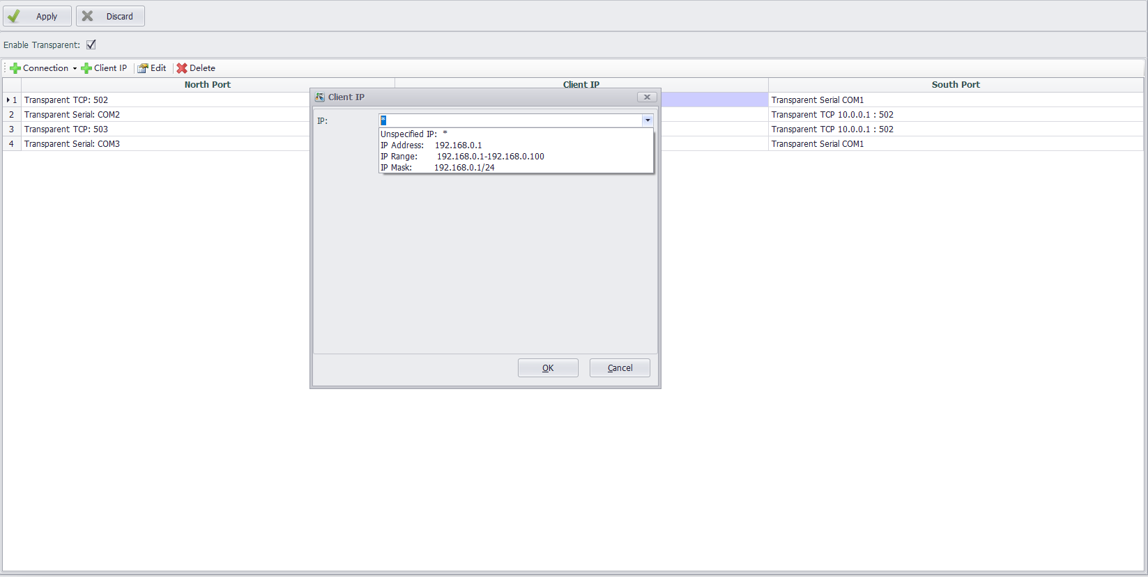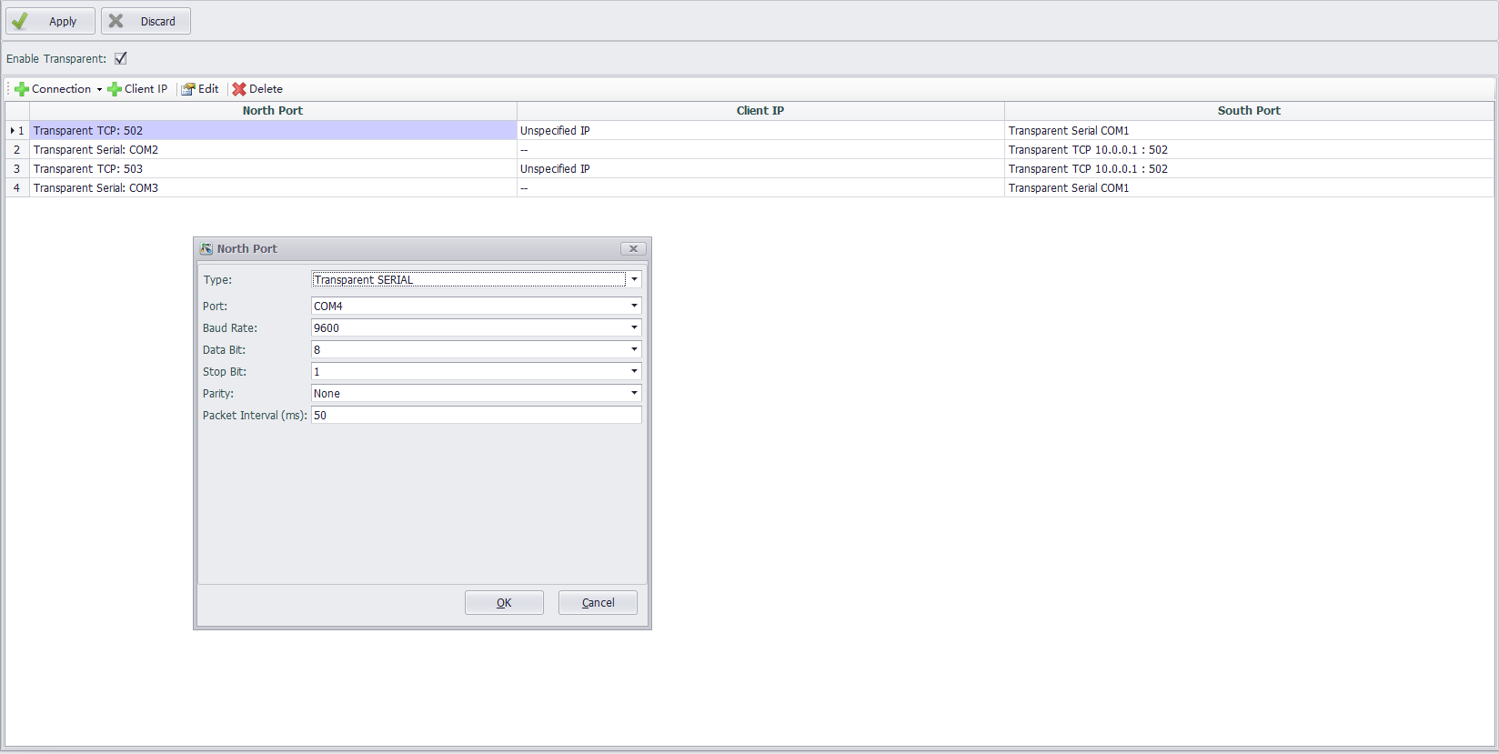 Note: When the northbound communication link is via network communication, Transparent Mode can only be enabled if either the maximum number of northbound TCP connections is 1, or the IP whitelist for northbound UDP/TCP is configured with a specific unique IP.