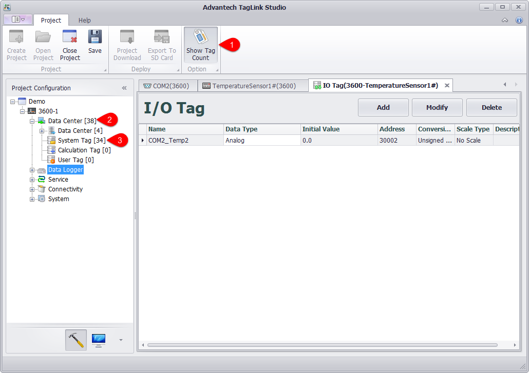 The total number of tags configured in the device is shown in brackets after the Data Center node.