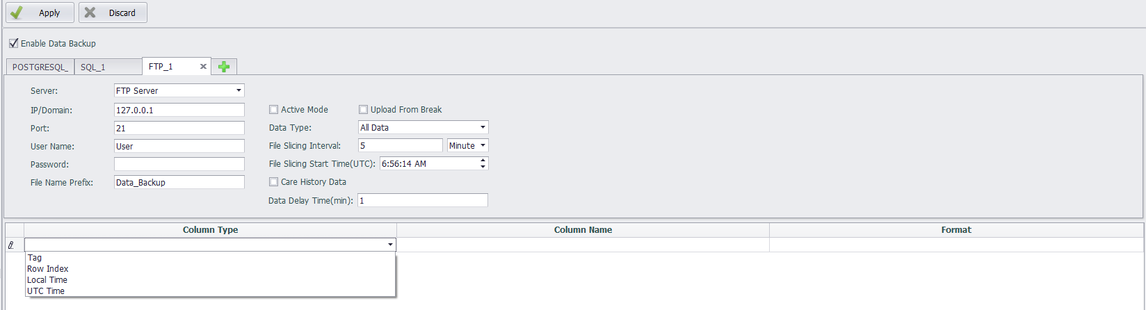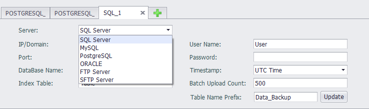 In the data backup settings area, select Server Type as PostgreSQL to back up the selected tag data in PostgreSQL mode. The information you need to fill out is same as SQL Server.