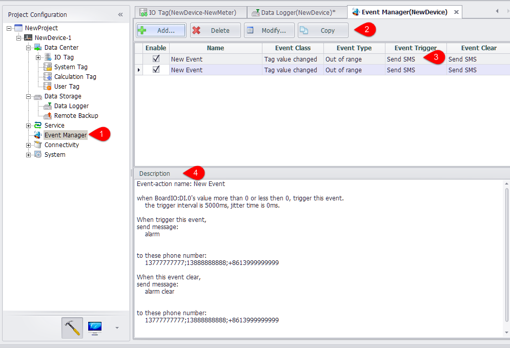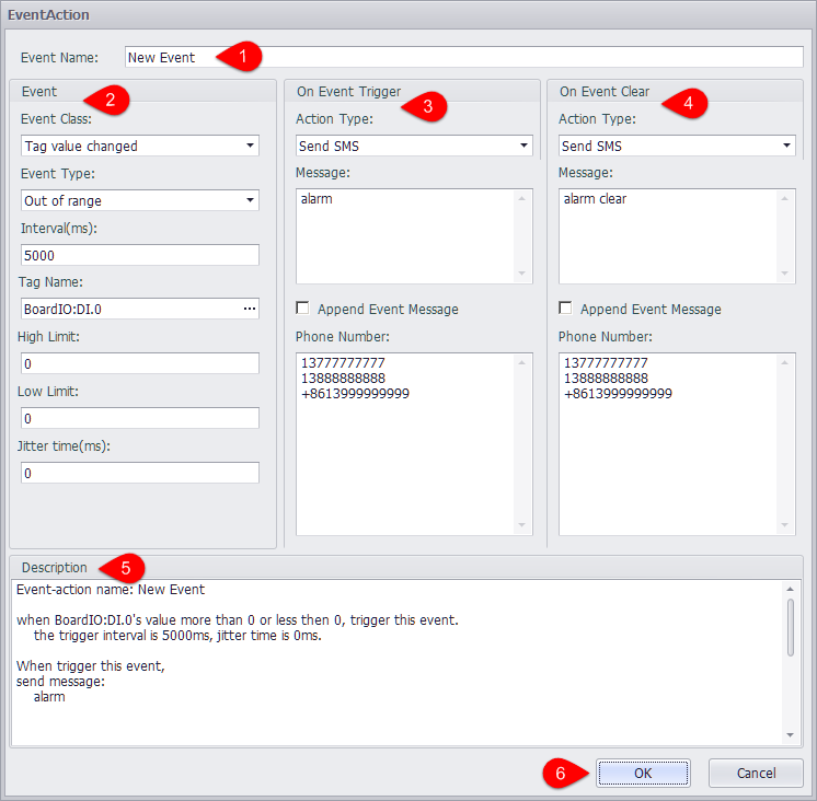 3. After the event is triggered, the message will be sent to the number in this text box. If there are multiple numbers, it should be wrapped or separated by the ';' semicolon.