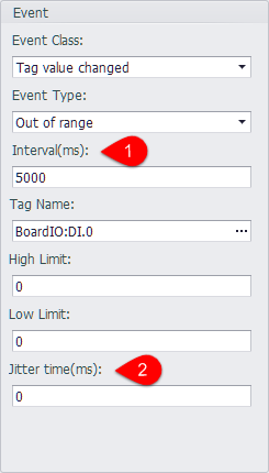 2. Jitter time means that the tag value exceeds the range or the quality is not good for the duration of time is less than the jitter time, then the event is not triggered.