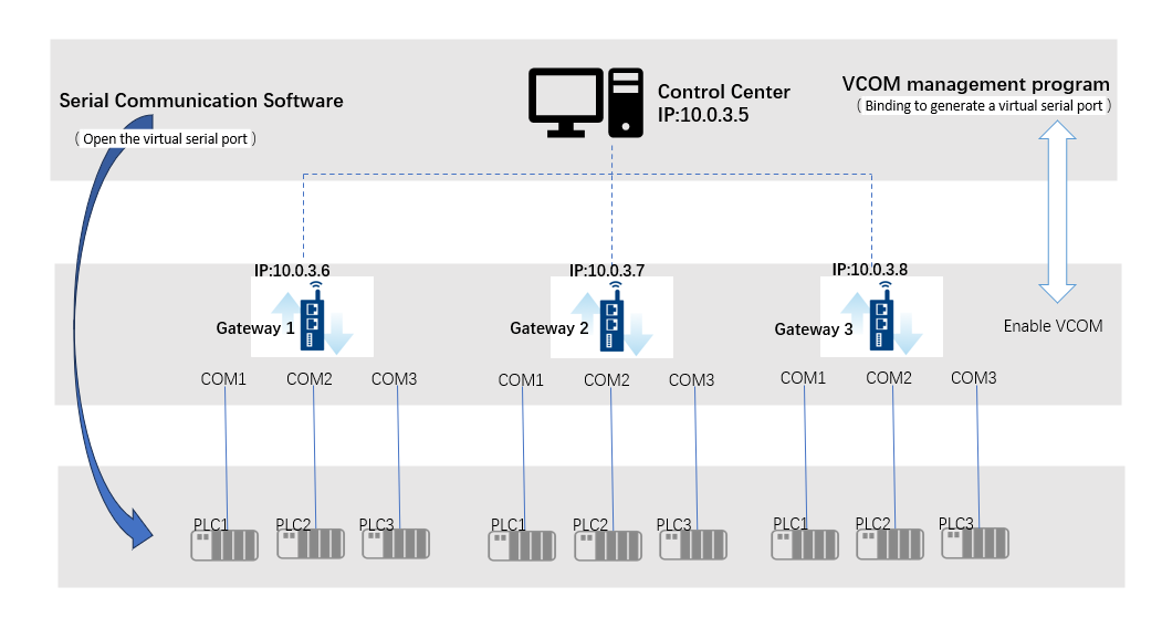 The general scenario involves a network connection (such as VPN) between the PC (control center) and the gateway, with serial devices (such as PLCs) connected below the gateway. Customers expect to use the serial communication software that comes with the serial devices to configure the serial devices on the PC (control center).