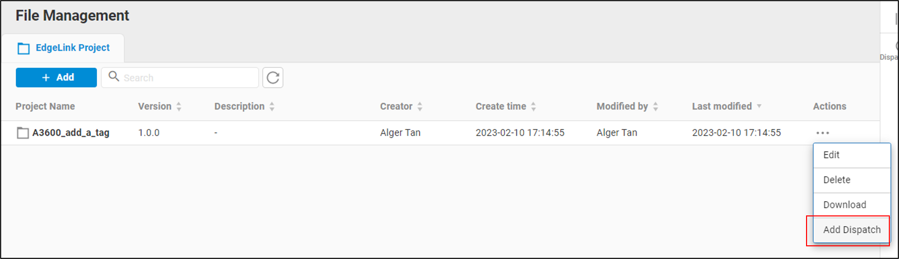 Find the corresponding project file in EdgeSync 360/EdgeHub and click Add Dispatch