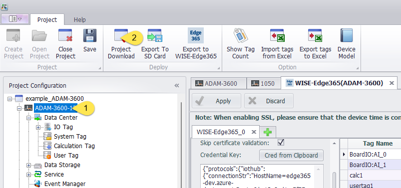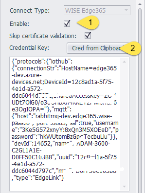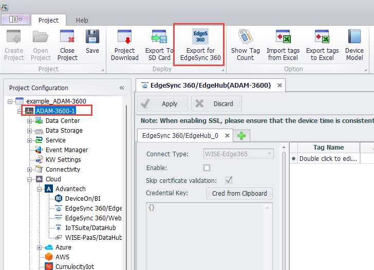 Open the EdgeLink Studio project configuration page for EdgeSync 360/EdgeHub by selecting "Project" > "Cloud Service" > "Advantech" > "EdgeSync 360/EdgeHub", and enable the connection