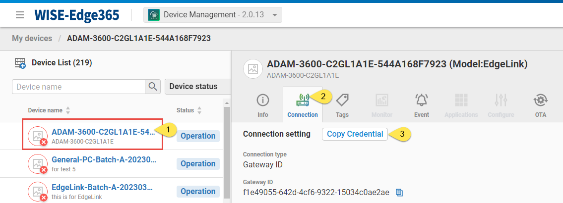 - Click on the newly added device, and the device information will appear on the right side. Copy the "Credential" to the clipboard