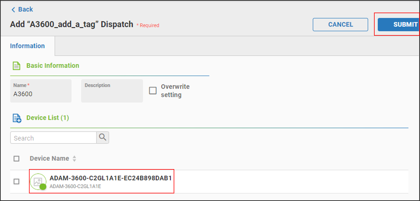 Add a Dispatch, enter a dispatch name, and select the corresponding device