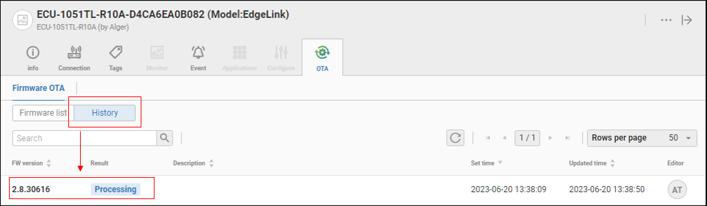 At this point, the user can click on "History" under "Firmware OTA" to view the current upgrade status