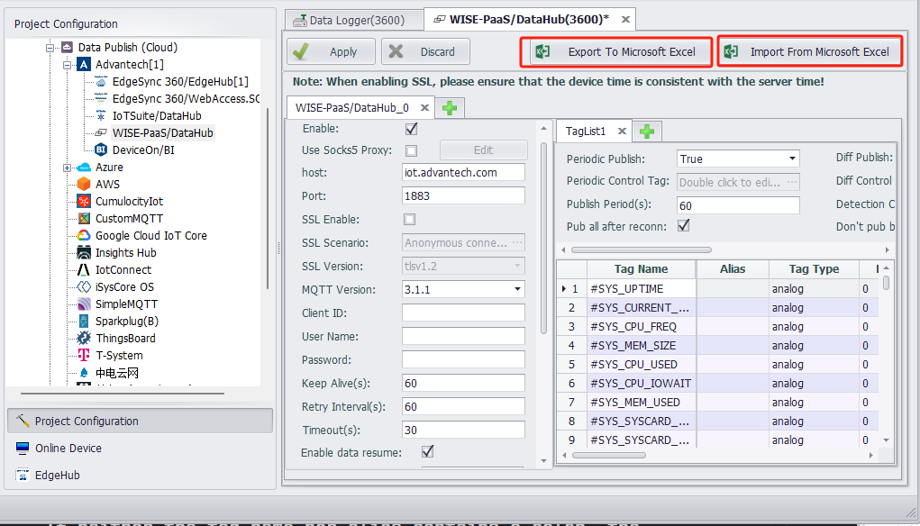 • EdgeLink Studio's cloud service configuration supports tag list import/export.