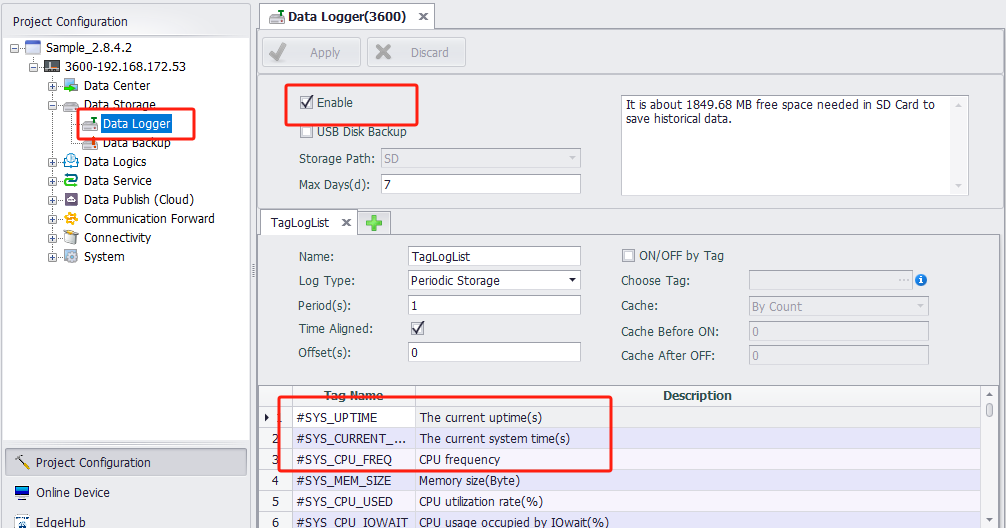 • Prerequisite: Configure tags for breakpoint resumption in DataLogger for local storage. The device must have a storage card. Refer to the DataLogger documentation for setup.
