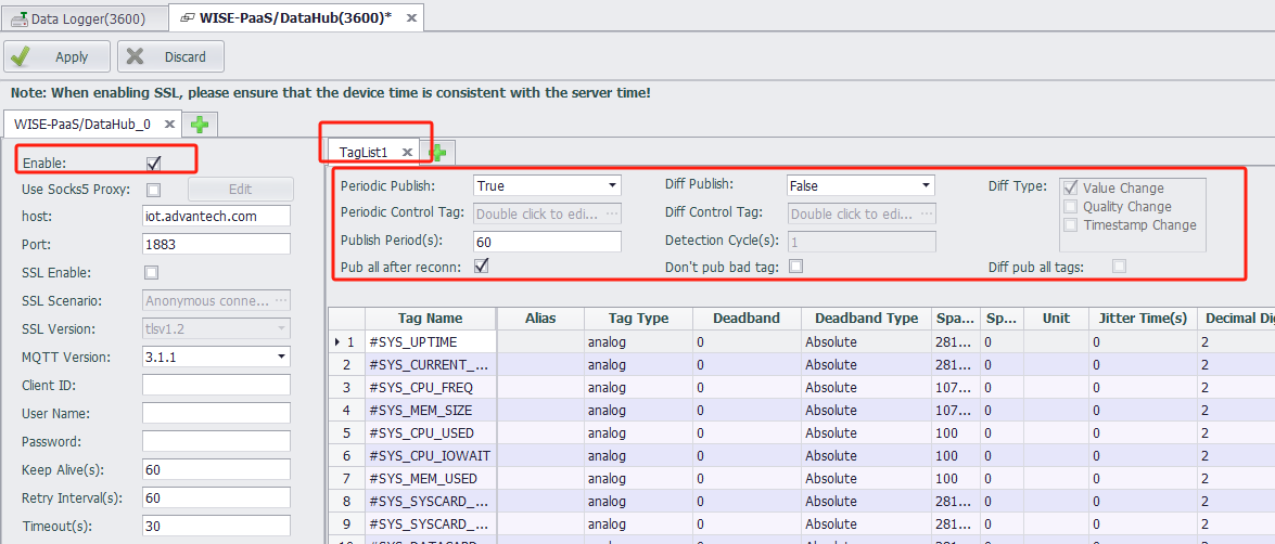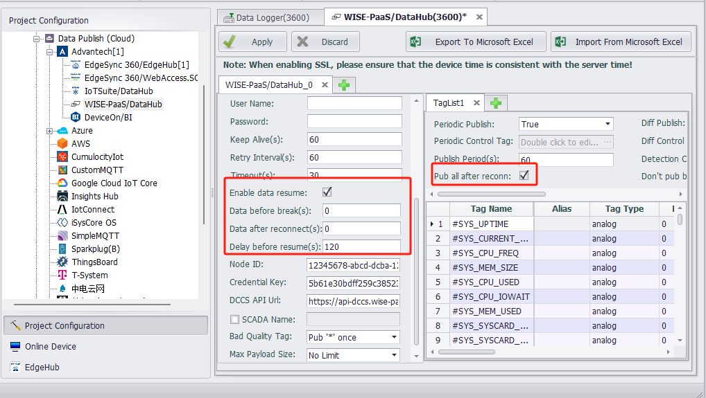 • Enable breakpoint resumption in WISE-PaaS/DataHub. The configuration below ensures that all current tag values are published immediately upon reconnection, and data upload resumes 120 seconds later, covering only the disconnection period.