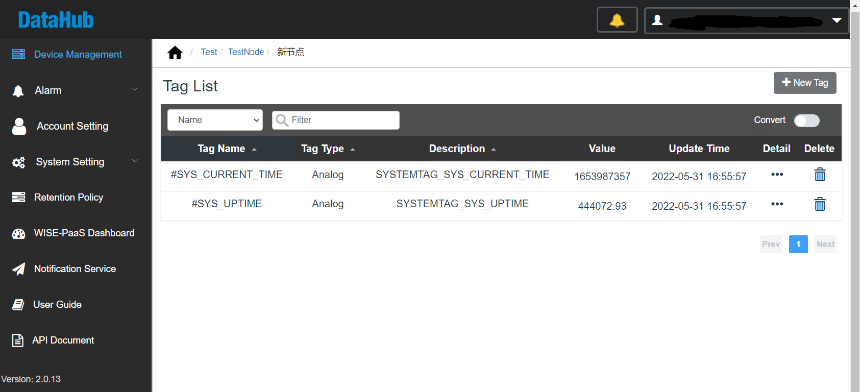• After successful restart, real-time data will be visible in the WISE-PaaS/DataHub interface, indicating successful connection and data upload from EdgeLink to WISE-PaaS/DataHub.