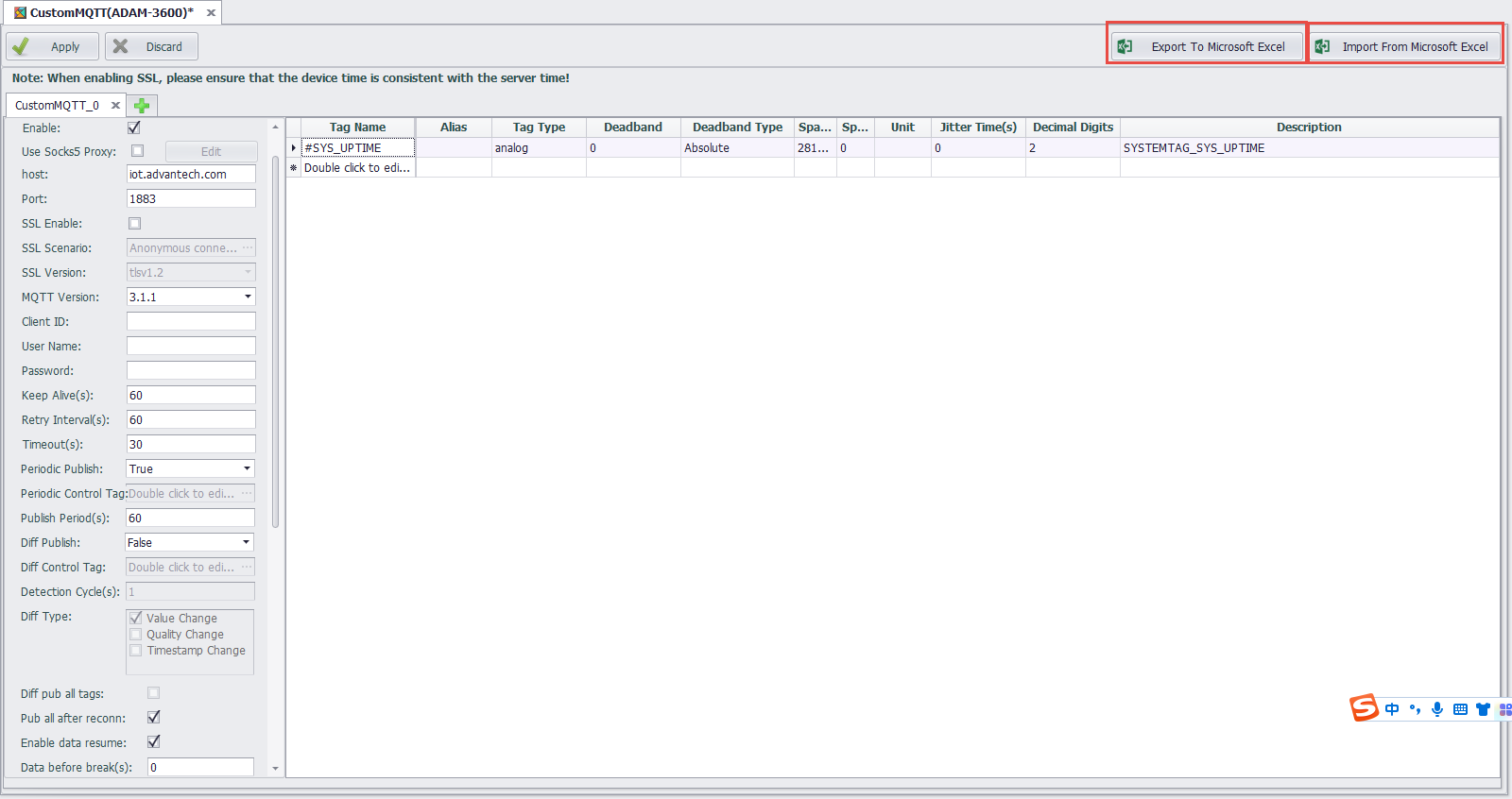 CloudothersExport/Import Tag List本頁導覽Export/Import Tag List The cloud service configuration interface supports the import and export function of point list (edited according to the specified format, which is convenient for adding or deleting tags in batches) excel format