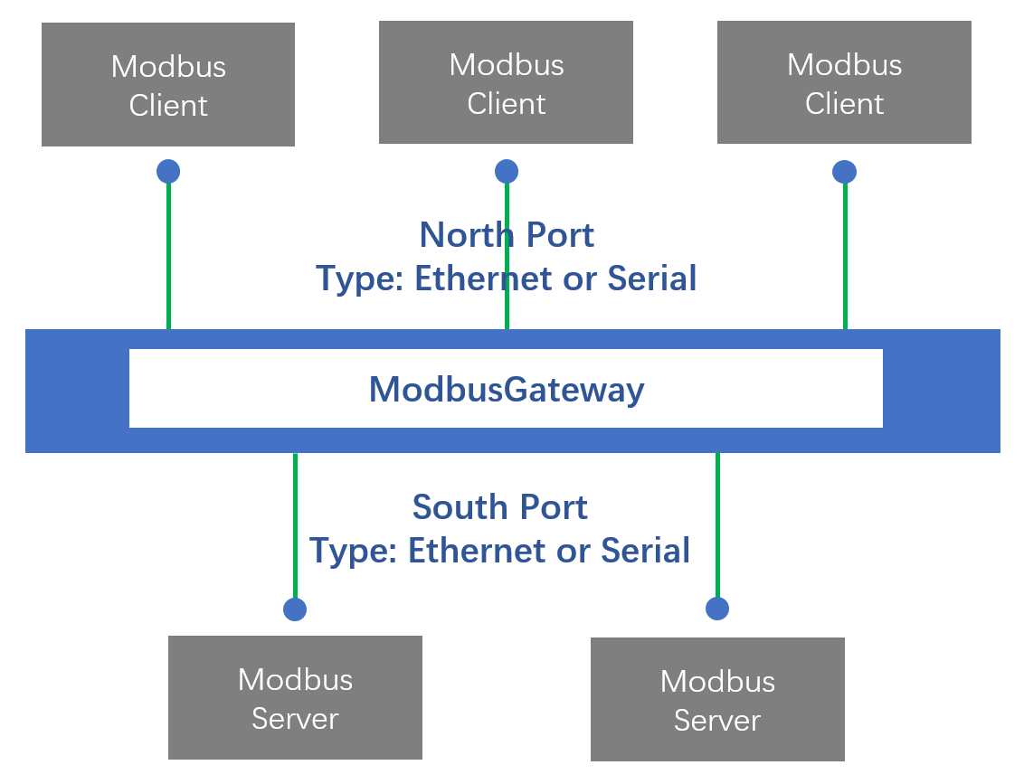The ModbusGateway program primarily performs the conversion between Modbus TCP and Modbus RTU protocols. The Modbus Client on the north side can directly access the Modbus Gateway program on the gateway device to connect to the instruments on the south side.