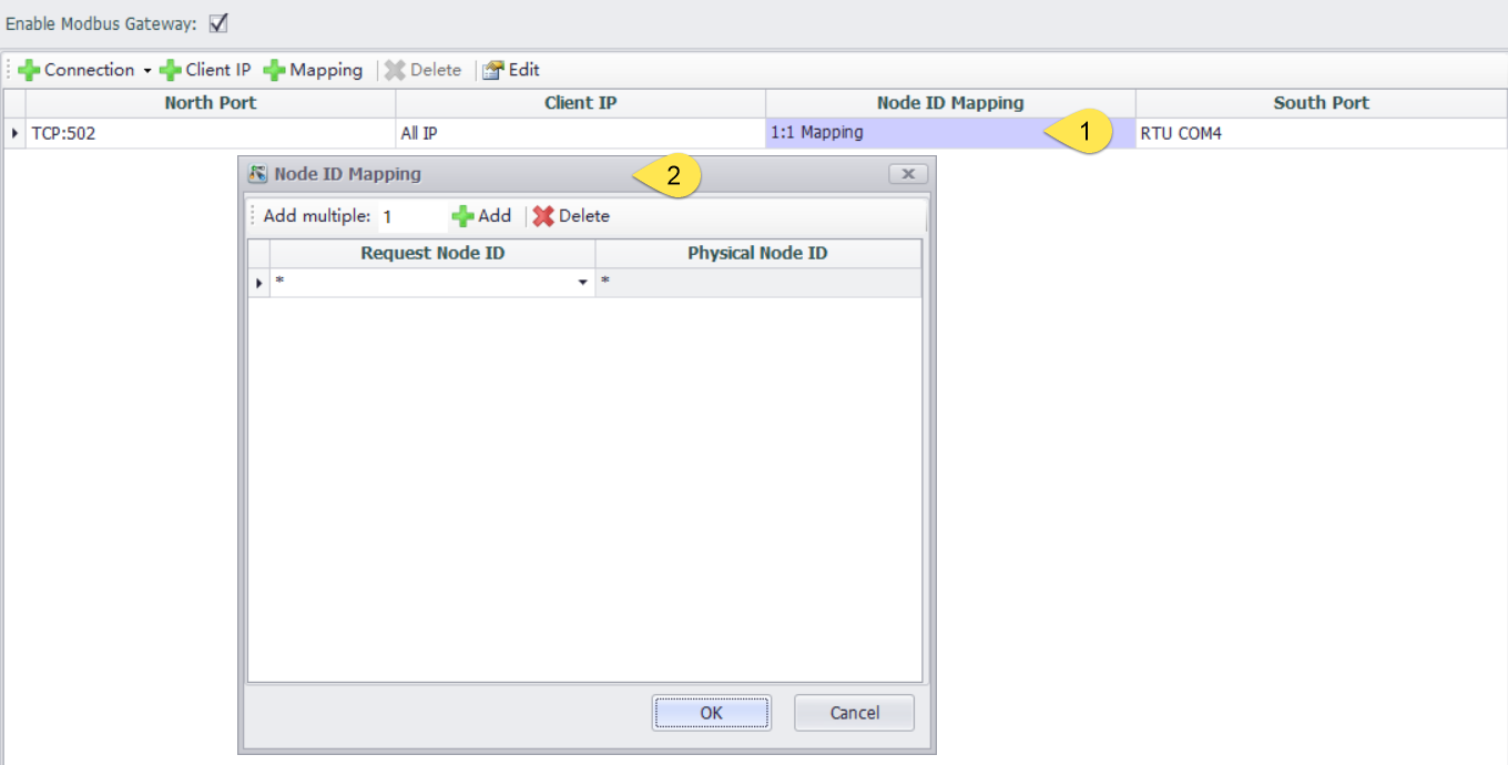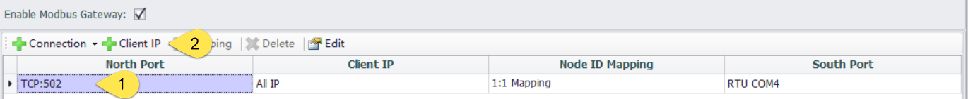 When the cursor selects any one of the client IP, node ID mapping, or southbound port, a new connection can be added, or a new client IP or node ID mapping and southbound port can be added