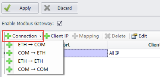 To enable the Modbus Gateway functionality, a connection from ETH to COM will be added by default.