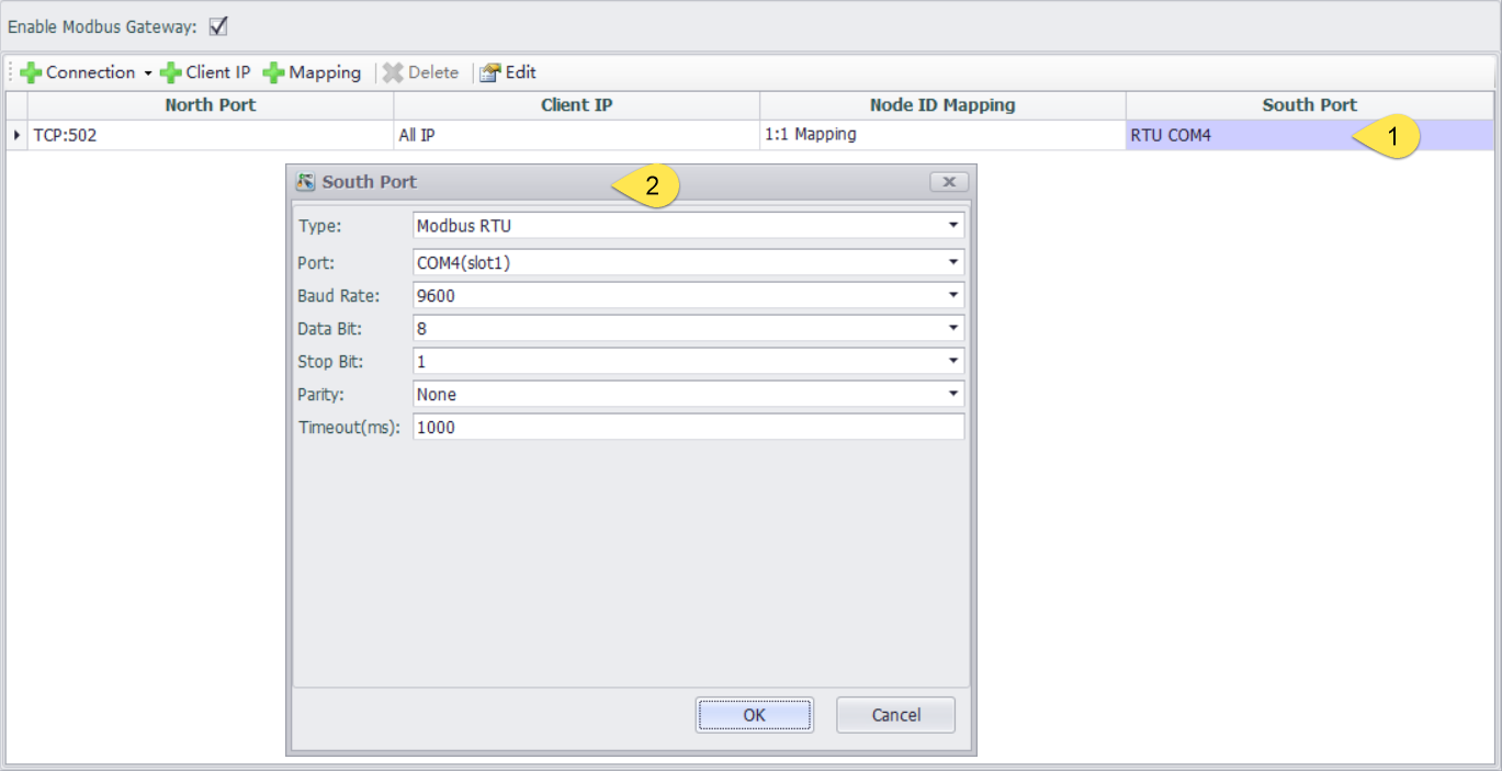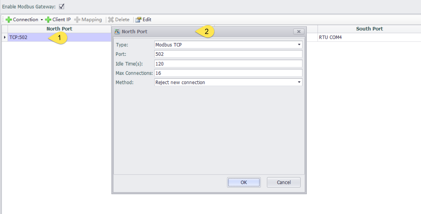 | North -direction port | The port type used by the client to send requests, TCP:502 means the requests are sent through the TCP port to access the Modbus Gateway using port number 502 |