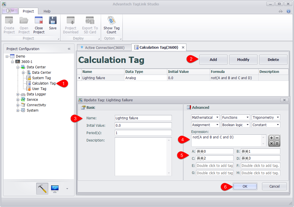 Each calculation tag corresponds to one expression which may support at most 8 tags as its input variables. For users' convenience, 8 tags are represented by A, B, C, D, E, F, G and H (case insensitive) in the expression.