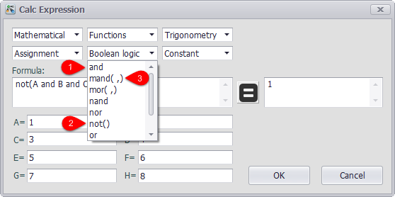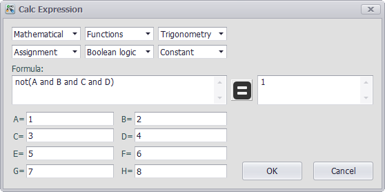 Through the drop-down boxes, users can set the functions and operators calculation tag supports, which is divided into five categories: "Mathematical", "Functions", "Trigonometry", "Assignment" and "Boolean logic". Moreover, "Constant" box is also provided, allowing users to select from three constants: pi (the ratio of the circumference to the diameter of a circle), epsilon (the smallest positive double value that is greater than zero) and inf (infinity).