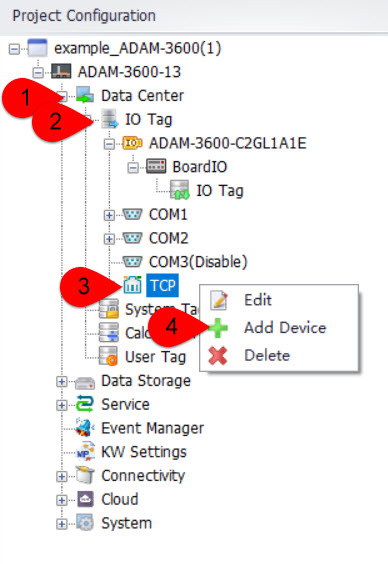 • DataCenter--->I/O Tag--->TCP--->Rigth click:Add Device