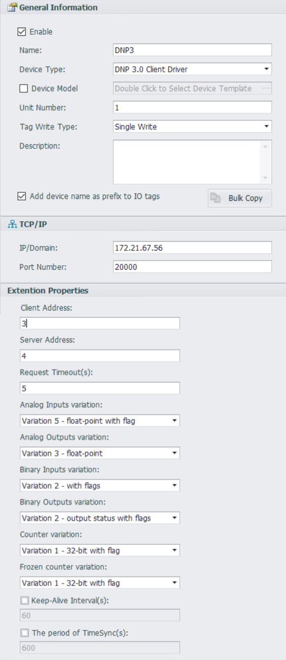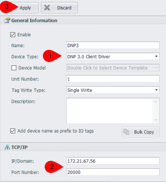 • Select Device Type:DNP3.0 Master Driver--->Fill in the DNP3 server IP and port number: such as 172.21.67.56 and 20000--->click "Apply"