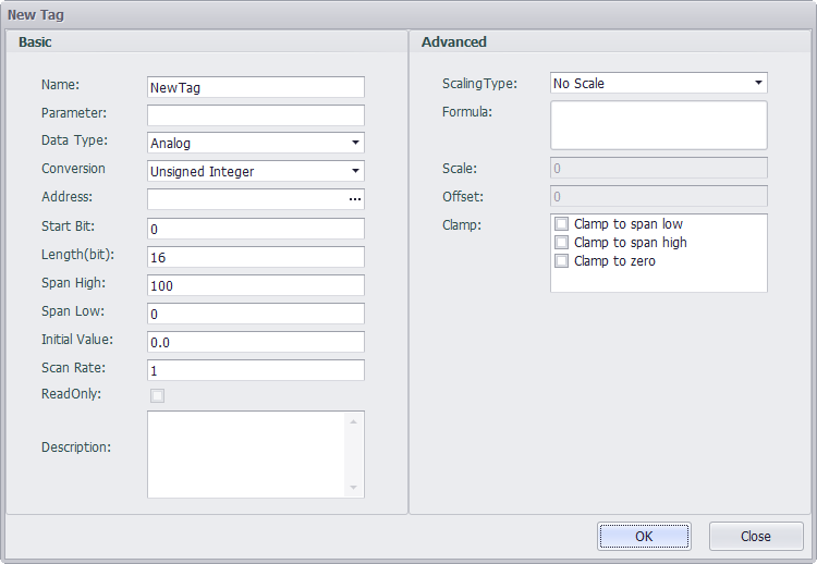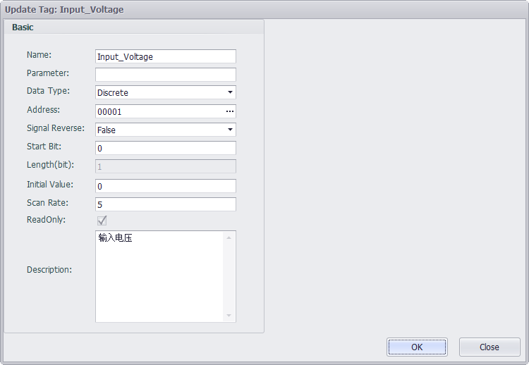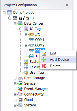 Click the Add button above the list of tags to add a new tag to the currently selected template.The tag information is similar to the IO Tag information in EdgeLink Studio. The added tag name cannot be the same as the other tags under the same template.