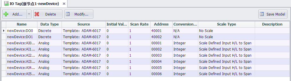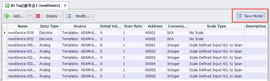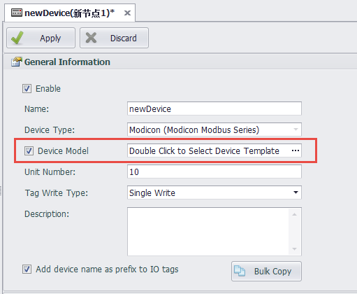 After clicking the OK button, the use template is set for the device. Click the Apply button on the device information page to add or update the device information. At the same time, the selected tag under the selected device template will be automatically added to the IO Tag list under the device.