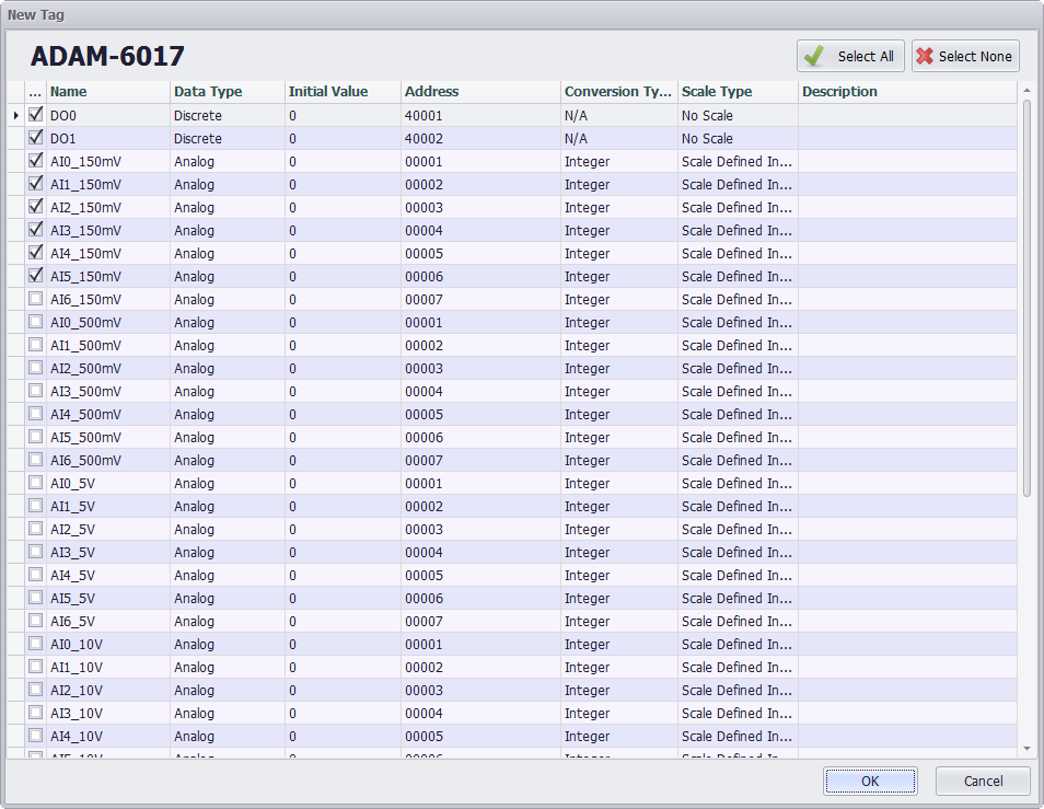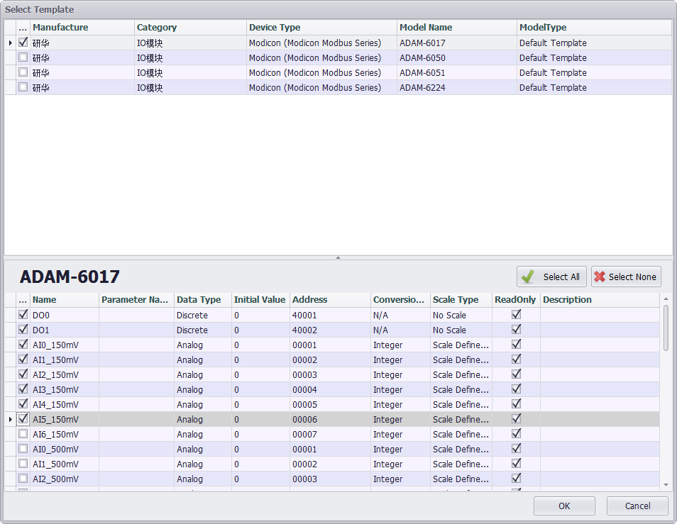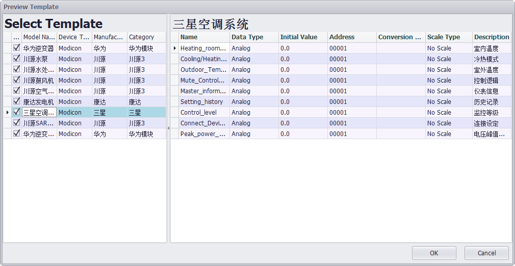 Double-click the device template selection box to bring up the panel to view and select all the device templates in the Default Template and User Template supported by the device driver. The tags under the template can be selected all or part of them.