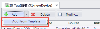 Click the Add button in the list of IO Tags to add tags customarily, and you can choose to add tags in bulk from the template by clicking the Add from Template button in the Add button drop-down menu.