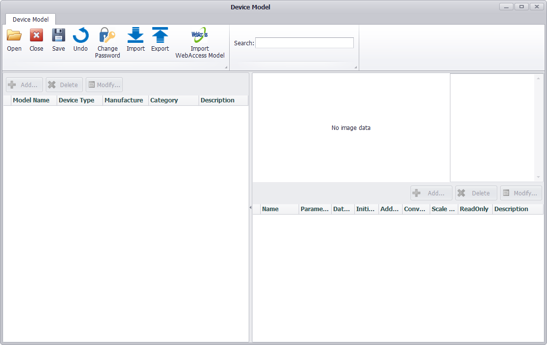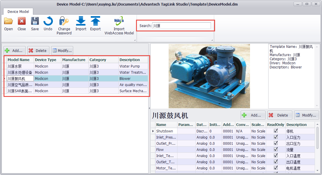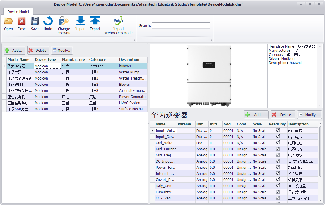 In the device template tool, the functions of opening, closing, saving, revoking, modifying password, importing and exporting, and importing Webaccess templates are supported.