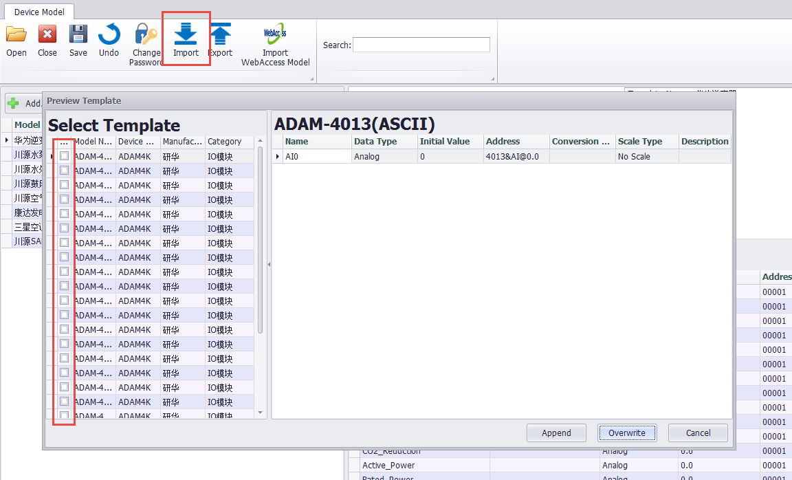 Webaccess template is an access database file in .mdb format. Click the Import Webaccess Template button, select the file to be imported, select the template information to be imported in the preview panel, click the Add button to import the selected template into the current template file, click the Overwrite button will clear the current template. Then import the selected template to the current template.