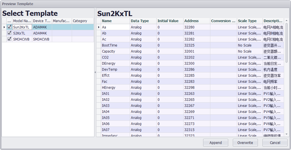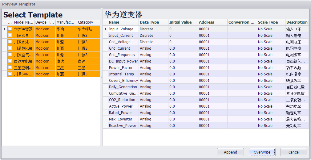 Select to open the template file to be imported, and users can view the template information in the preview panel. Check the template information to be imported. Click the Append button to import the selected template into the current template file, click the Overwrite button to clear the current template and then import the selected template to the current template.