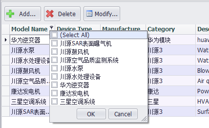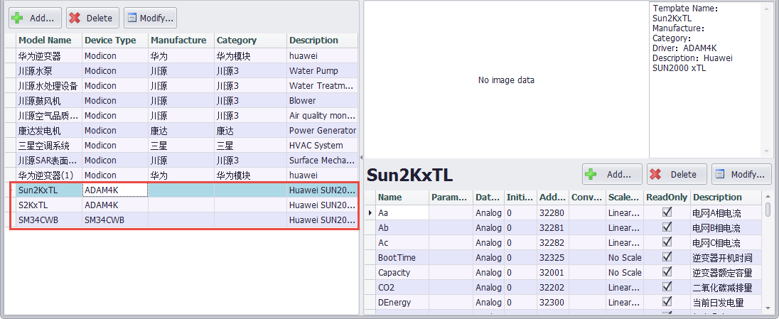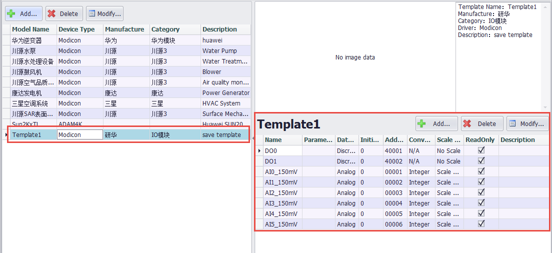 In the device template tool, users can view, sort,search, filter, add, modify, and delete templates, and add, modify, sort,and delete tags included in the template.