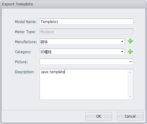 The tag information under the device can be saved as a template on the IO tag list page. Click the Save Template button to pop up the input template information panel. If the user template has an open password set, you will need to enter the open password to save the template.