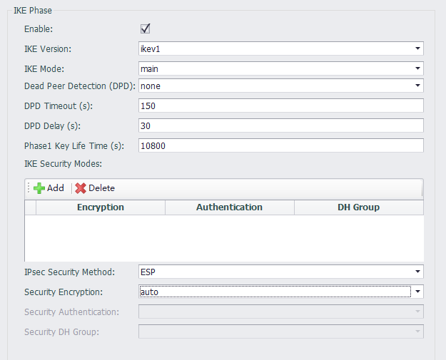 目前支持IKEv1 IKEv2模式,也可以设置为Auto模式,由协议自动进行配置。