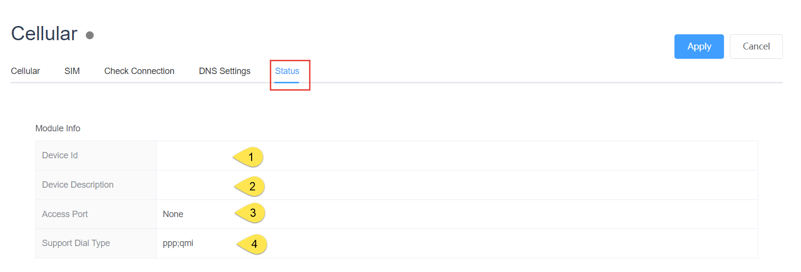 View module status online, divided into two parts, one is module status and the other is Celluar information, including dial-up and network status