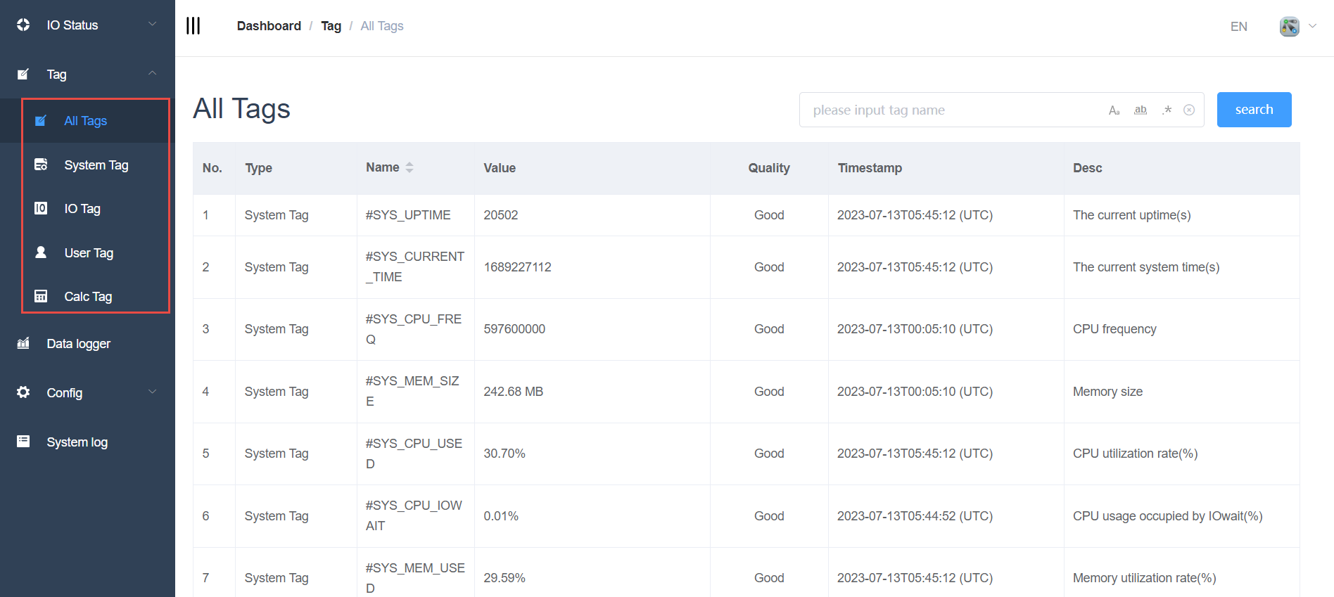 EdgeLink online operation provides the function of obtaining and setting Tags, different Tag types correspond to different pages, System Tag, IO Tag, User Tagand and Calculation Tag, and support unified viewing of all tags.