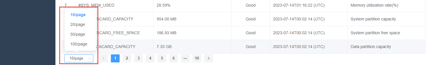 - The default number of displayed rows of the page is 10 rows, or you can choose to display the number of rows per page::10\20\50\100