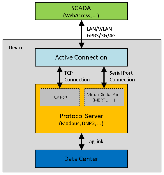 The main application scenario of active connection: RTU can directly access SCADA center, while the latter has no direct access to the former. RTU connected via cellular wireless connection or RTU behind the firewall is such kind of situation. In this case, the traditional TCP connection created by SCADA is not applicable any more. It should be the responsibility of RTU to actively connect with SCADA which will access data in future through this connection.