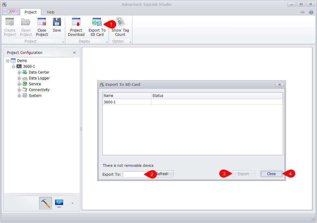 This function exports the configured project to the SD card. In the absence of a network connection, the SD card can be plugged into the device to update EdgeLink.