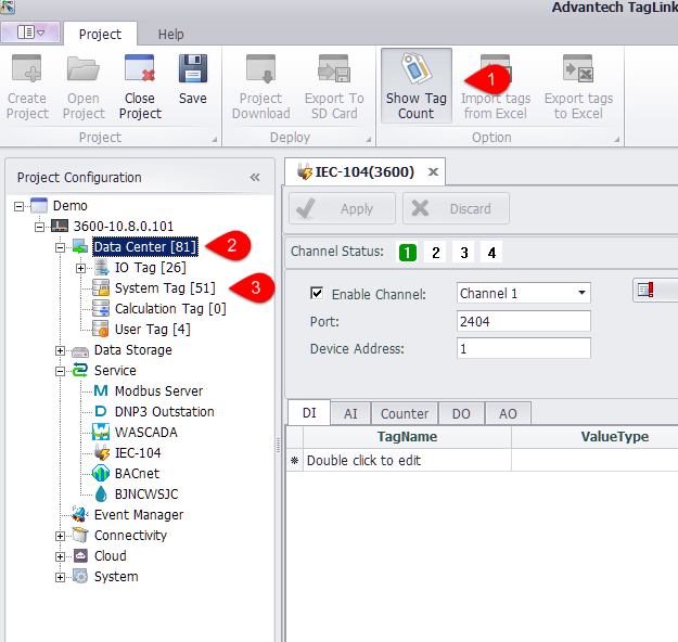 Click "Show Tag Count" to show the number of the configured tags of each device under a project.