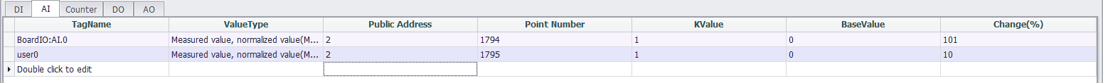 3. At the bottom of the interface is the tag corresponding table, including DI, AI, Counter, DO, AO five types of data tags.