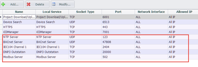 The firewall contains local services including "Modbus", "DNP3", "IEC104", "BACnet", "NTP". These services will add this service when enabled the default settings to the firewall restrictions.When the service is disabled, all relevant settings in the firewall will be removed.