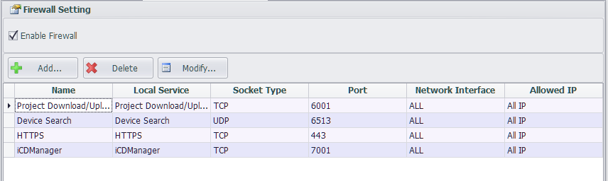 After the new device is built, the firewall will start by default and include "project upload/download", "search device" and "HTTPS" three local services. "Project upload/download" and "search device" are required for local services, and at least one of these services needs to be kept.