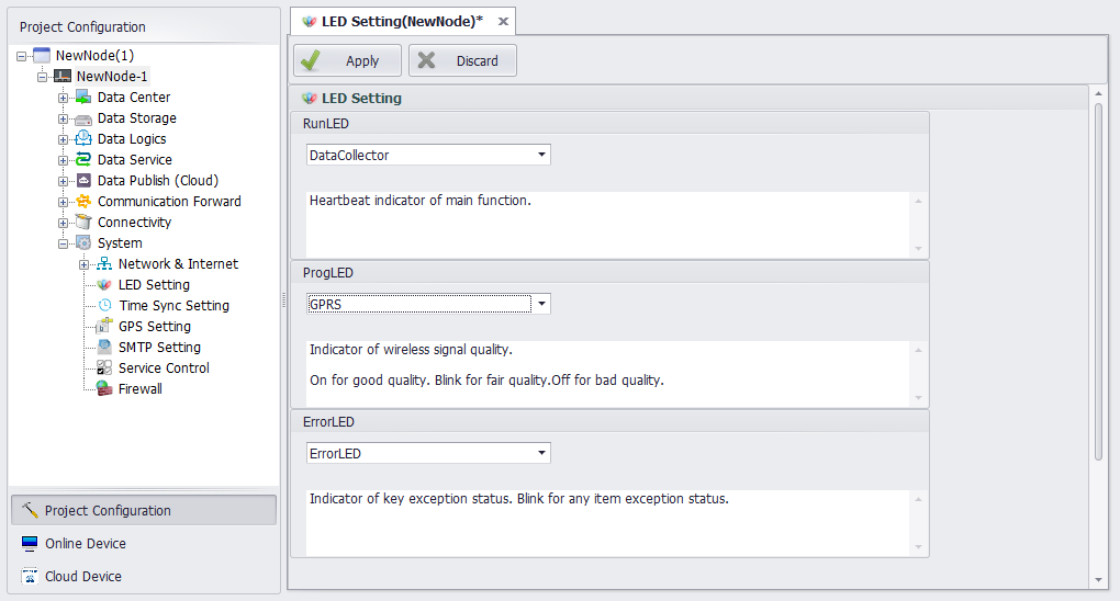 In this page, users can set the working modes of LED indicators on RTU, including RUN, PROG and ERROR.