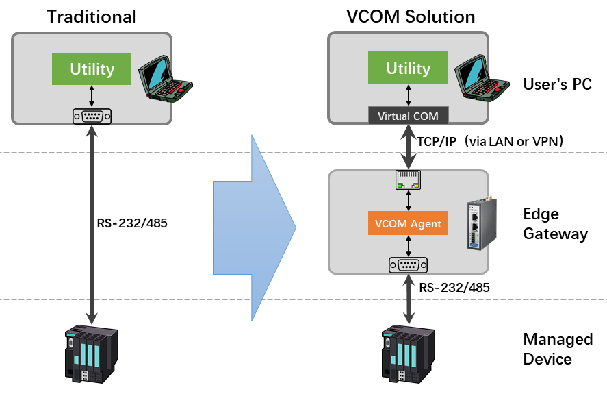 - The VCOM function is designed for the purpose of remote device maintenance. It is suitable for applications that are not sensitive to communication delay and not long operation time applications, such as parameter configuration, firmware update, etc. Do not use it as a remote serial server.