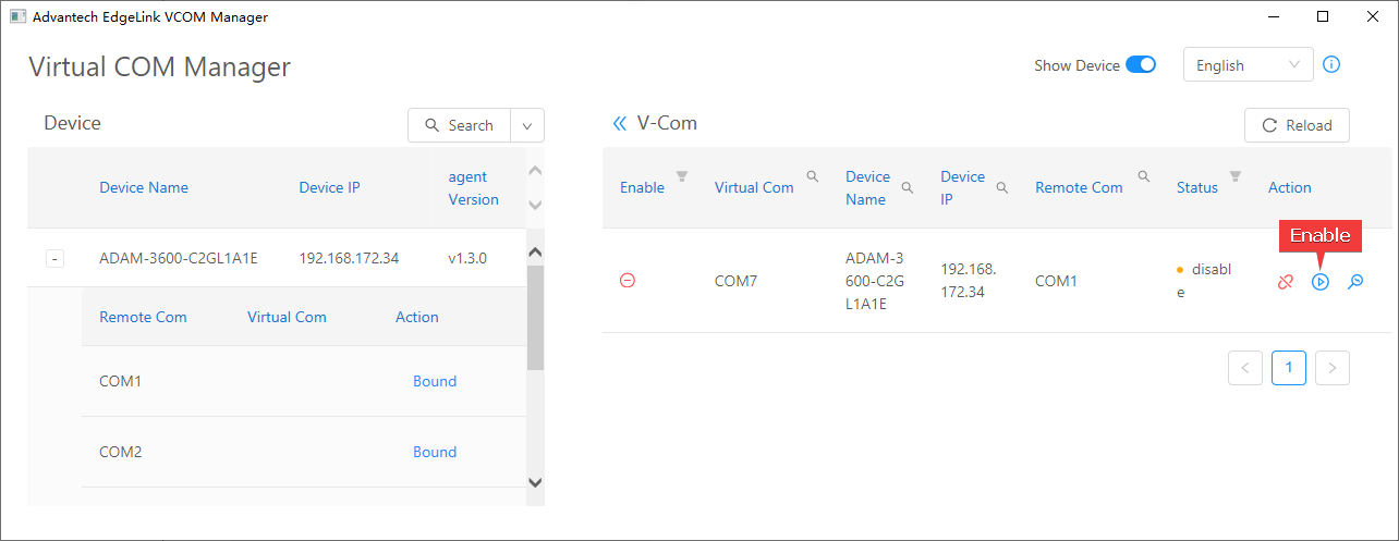 The bound serial port is displayed in the V-Com list on the right side of the main interface, as shown in the figure below.