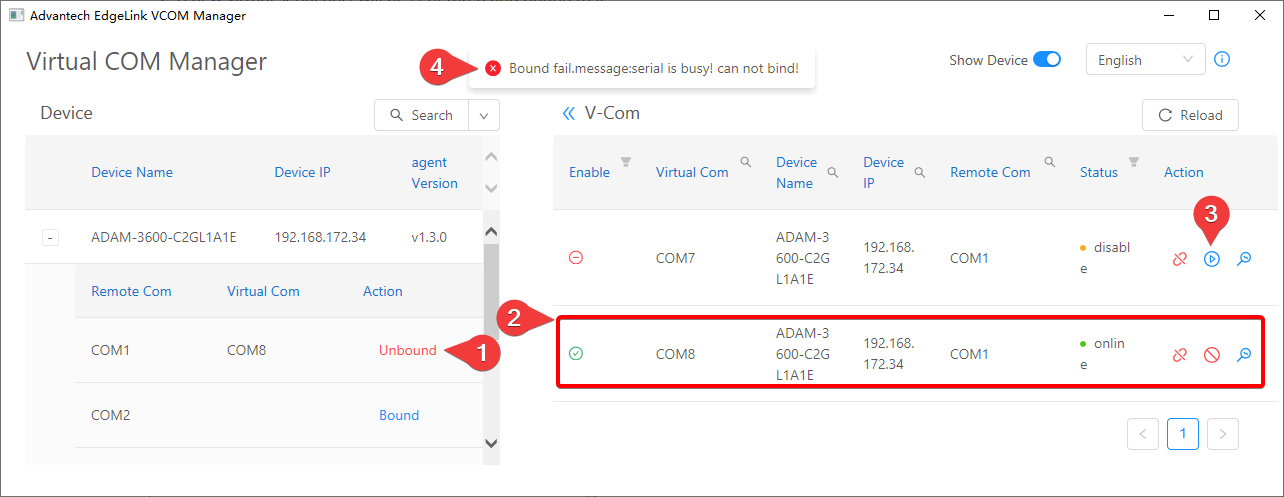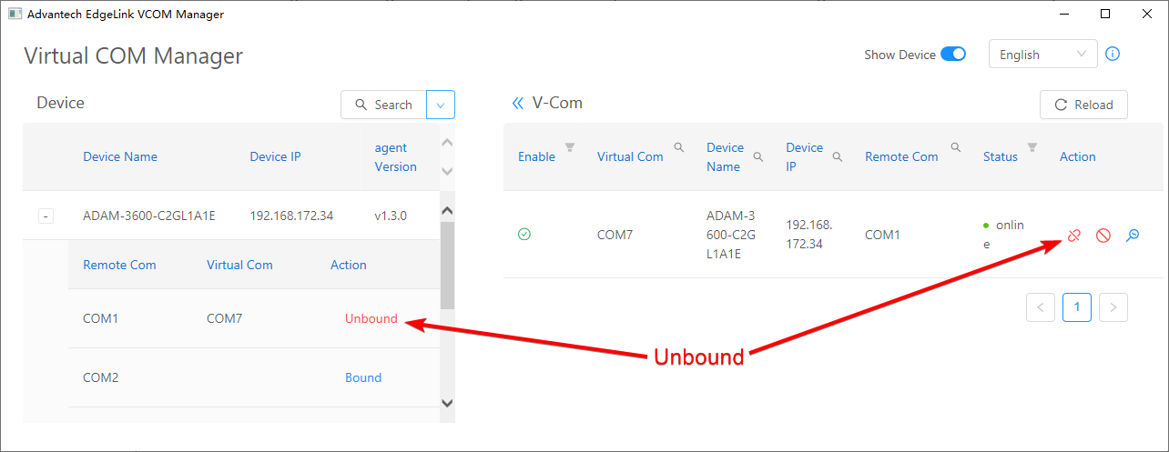 - Unbound: Unbound the virtual serial port and the physical serial port, and delete the virtual serial port from the management host.