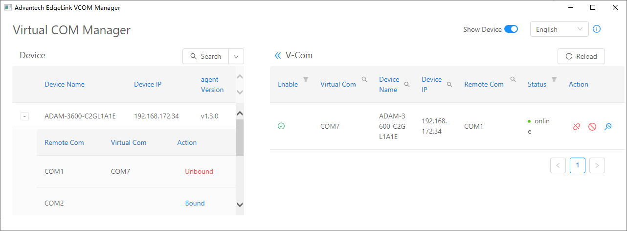 The main interface of the VCOM management program is shown below. The left half shows the information of the online device, including the device name, device IP, version number of the serial port agent (vcom-agent) and the list of physical serial ports contained in the device. The right half shows the list of virtual serial ports currently created by the management host, including the status of the device serial ports bound to the virtual serial ports.